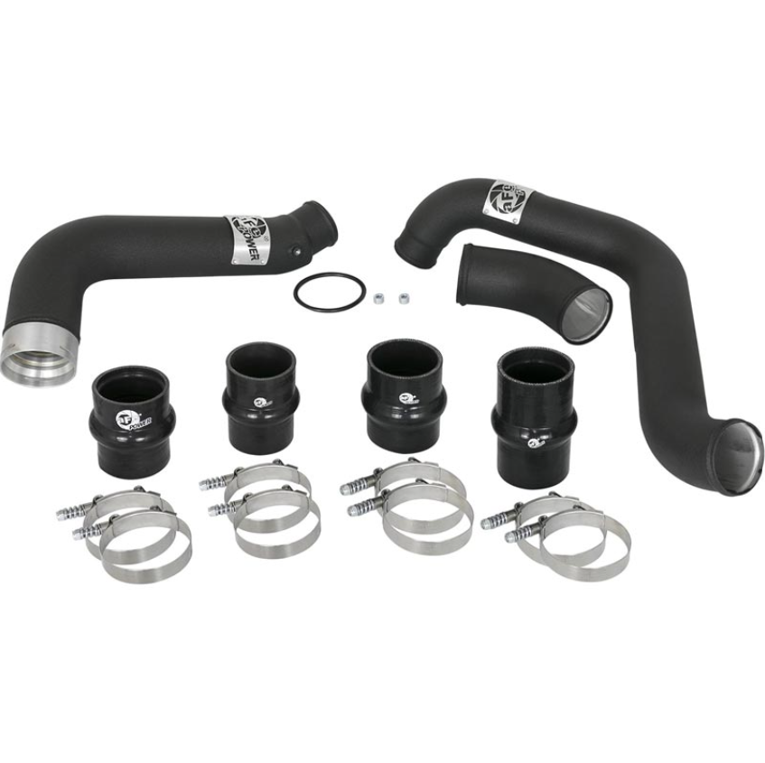 DESCRIPTION Increase airflow over the factory intercooler tubes in your 2017-2019 GM 6.6L Duramax L5P with the AFE 46-20334-B Bladerunner Hot & Cold Intercooler Tube Kit. With their TIGwelded aircraft-grade aluminum construction, the BladeRunner intercooler Tubes can handle higher horsepower and boost while directly mounting in the factory location utilizing quality hardware and 5-ply silicone couplings. Flow and Performance: Both intercooler tubes are mandrel bent and powder coated for maximum flow and performance. Smooth transition bends decrease turbulence and minimize pressure loss, increasing horsepower, torque and lowering EGT's. The BladeRunner intercooler tube kit transfers hot air smoothly to the intercooler to accelerate heat transfer then cooled air to the engine to help make more power. Perfect Fit: Factory mounting locations, quality stainless steel spring-loaded T-Bolt clamps and heavy-duty 5-ply polyester reinforced silicone couplings ensure a secure install. The cold side tube includes a factorystyle quick connect with an O-ring seal for a quick and simple install. 1/8" NPT ports are provided on each tube for connecting auxiliary sensors and retains the factory air temp sensor for a hassle-free installation. Custom Appearance: The wrinkle-black powder coat finish is completed with a unique aluminum laser-cut AFE Power logo that's welded on for a custom look.