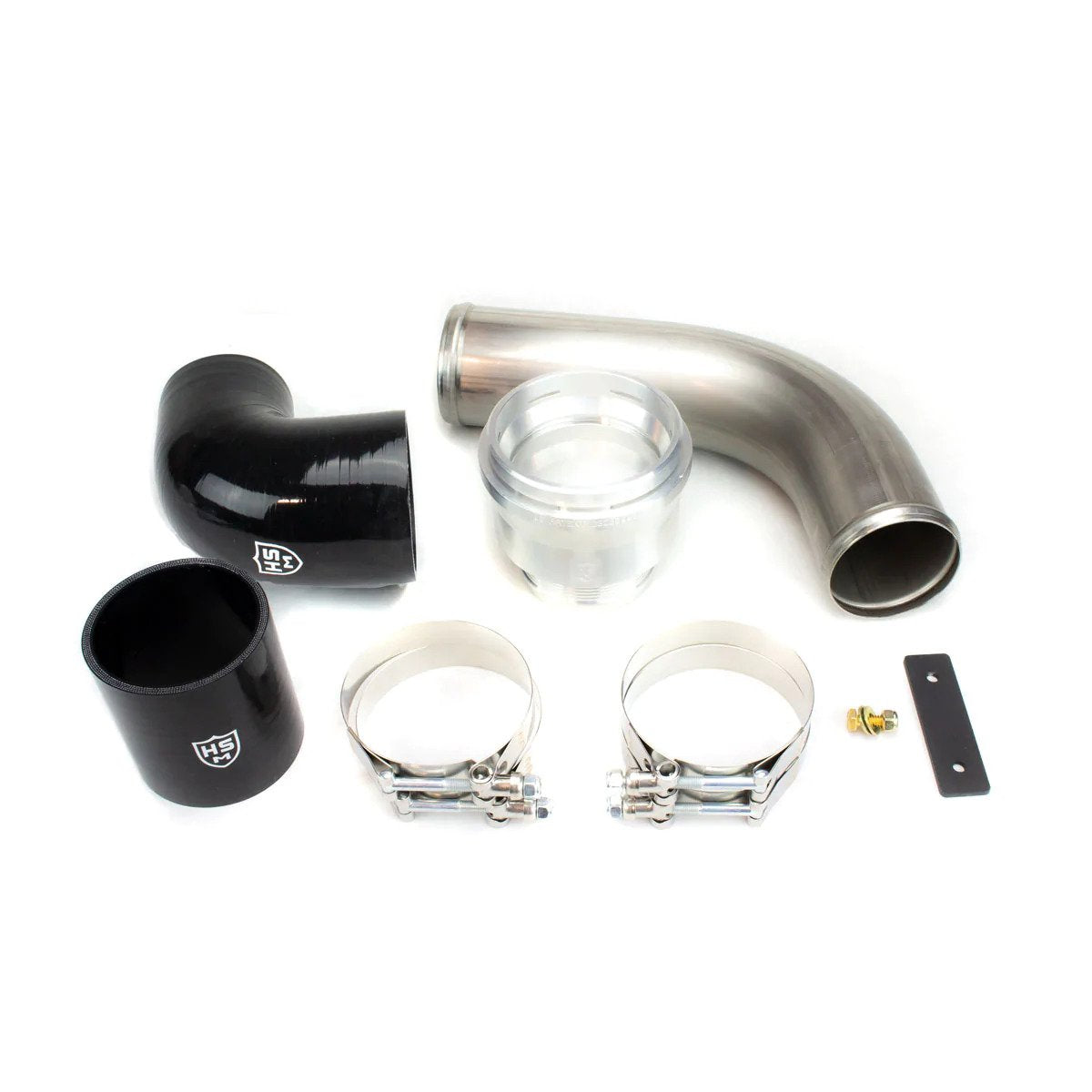 H&S Motorsports is proud to introduce the Intercooler Pipe Upgrade Kit for the 2017 - 2022 6.7L Ford Powerstroke. This kit allows you to replace the factory plastic (yes, plastic) intercooler pipe with a high quality bead-rolled metal pipe. While that may seem simple, there are other crucial components included in the kit to allow a quick, easy installation. Since the OEM pipe snaps onto the factory air intake valve rather than using a traditional clamp, we include a beautiful CNC-machined aluminum piece that snaps into the OEM location. Also included with the kit are all the brackets, clamps, and hardware required to complete the installation quickly and painlessly.