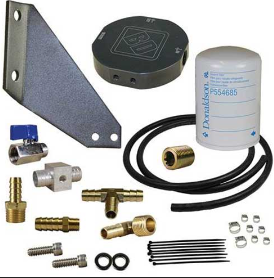 DESCRIPTION The BD-Power Coolant Filter Kit helps prevent potential engine damage on your 2003-2007 Ford 6.0L Powerstroke. Residual powder from engine castings and hoses, and the anti-freeze breaking down from high exhaust temperature creates a plugging slurry which can cause the the engines coolers to plug. This easy-to-install kit is mounted in-line with the engine coolant hoses and comes complete with a BD-Power engraved filter head, spin-on filter, mounting bracket, hoses, clamps, fittings, mounting hardware and a bypass valve for easy change of filter. Features: Easy-To-Install Removes Coolant Contaminants Includes Donaldson P554685 Filter.
