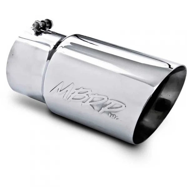 MBRP Inc Offers high quality T-304 Stainless Steel exhaust tips for diesel systems. Each tip is polished to a mirror finish to highlight any exhaust system. Heavy Duty "BoltOn" Syle, no bulky clamps to hold tip onto tailpipe. Allows for maximum adjustability. 5" inlet, 6" outlet, 12" length